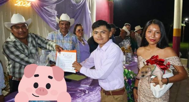 HIDALGOTITLÁN, VER. – Una madrina de graduación comienza a viralizarse en redes sociales, luego de que a través de un video se le observa cargando un cerdito que dará como regalo a su ahijado, durante la ceremonia de clausura. Las imágenes fueron captadas en la graduación de estudiantes en una escuela de la comunidad Macayal perteneciente al municipio de Hidalgotitlán, al sur del estado de Veracruz.