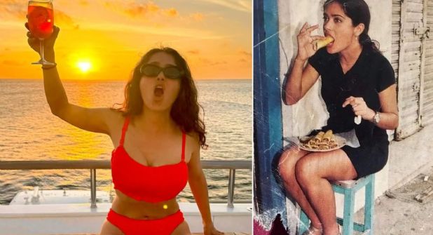Una fotografía de Salma Hayek comiendo tacos se volvió viral en 2021. A la actriz, en su juventud, se le ve comiendo tacos en Coatzacoalcos.