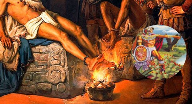 La tortura de la que hablamos es aquella donde le quemaron los pies, y para ello calentaban placas de metal e incluso piedras al rojo vivo, para después colocar el metal en las plantas de los pies, mismo que infligía un dolor terrible en Cuauhtémoc dejando heridas en sus pies, y durante esta tortura, se le preguntaba dónde estaban los tesoros aztecas, y al no revelar nada, se le dio el respeto y admiración por parte de los mexicas.