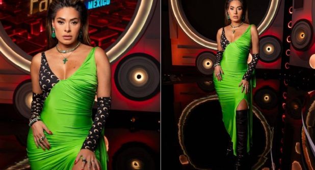 La conductora de 'Hoy', Galilea Montijo, lució un vestido en color verde fosforescente o fluorescente con motivos de medias lunas de color blanco sobre un fondo negro. Es de la creación de la reconocida diseñadora de modas francesa Marine Serre.
