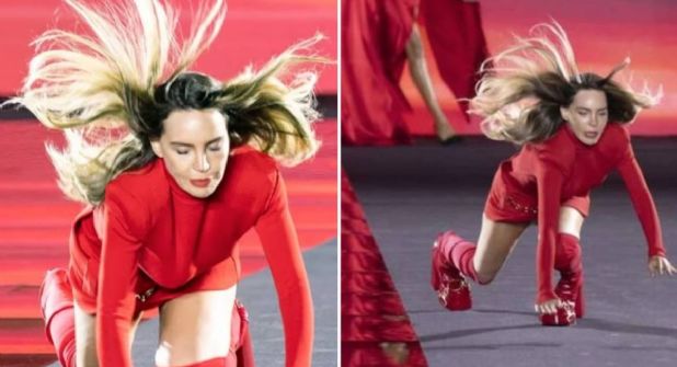 La famosa cantante de pop caminaba por la pasarela, pero se tropezó con sus mismas botas, pero la cantante brasileña Anitta la ayudó a levantarse para seguir en el desfile.