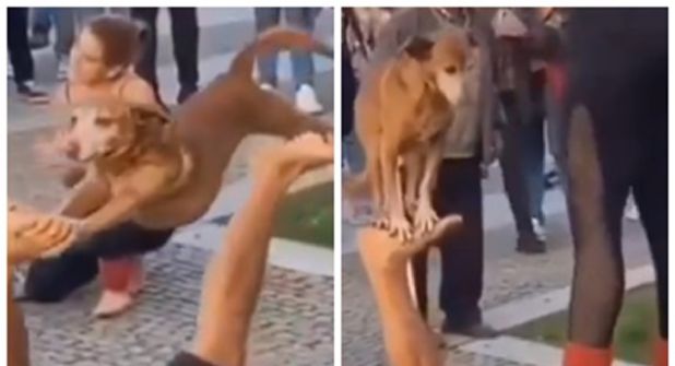 La emoción aumenta entre los espectadores al ver a la mujer levantar al perro lentamente, primero con cuidado para asegurarse de que no pierda el equilibrio, y luego extendiendo completamente las piernas.